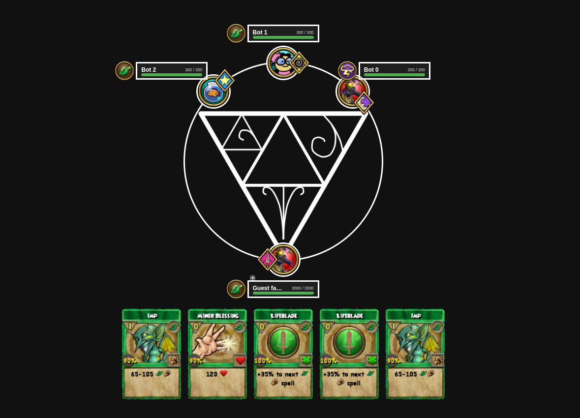 In the video game Wizard101, players engage in a magical turn-based card game. I intend on using reinformance learning to design a competitive opponent. However, I first needed to create a local environment to train the model. From this, I got inspiration to make a hosted, GUI version of the demo.